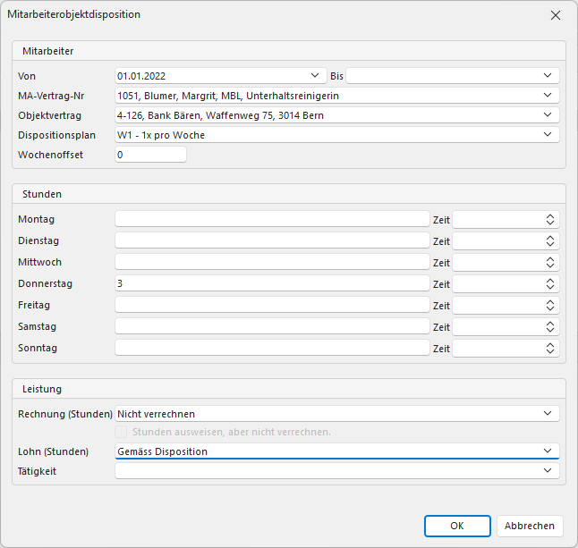 | Wochenoffset | Verschiebung der Startwoche um den gesetzten Wert. Alle Dispositionspläne starten mit Woche 1. z.B. Reinigung alle zwei Wochen, in den geraden Wochen = Wochenoffset 1 |