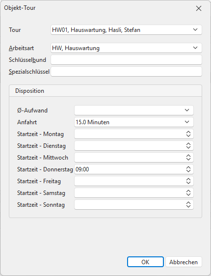 Die Tour (Leistungserbringer) wird im Objektvertrag als Objekt-Tour hinterlegt. Dabei werden alle Arbeiten der entsprechenden Arbeitsart von diesem Leistungserbringer erledigt.