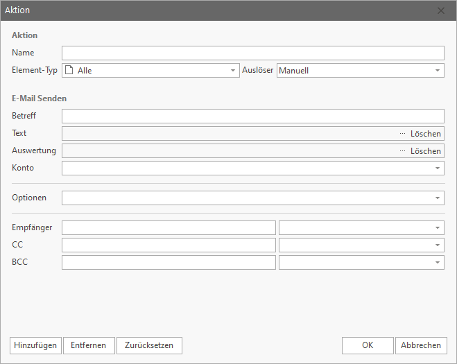 | Empfänger, CC, BCC | Feste E-Mailadresse eingeben oder Kunde, Ansprechpartner, Subunternehmer, Zuständig, E-Dokument Empfänger auswählen. |